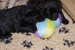 Ab der fünften Lebenswoche übersiedeln Welpen und Mutterhündin in das Welpenzimmer, dann beginnt es richtig loszugehen. Wenn unsere Wave Lab Minis vier Wochen alt sind, wird es sehr aufregend für sie: Sie werden an den Welpengarten gewöhnt und das bedeutet für sie - viel Platz zum Spielen und Tollen, gemütliche Plätzchen zum Ausruhen und Kuscheln, verschiedenstes Spielzeug zum Herumtragen und Beknabbern. Jede Woche wird der Welpengarten um ein Stück vergrößert und mit neuen Elementen erweitert. Außerdem werden mit den einzelnen Welpen Erkundungsspaziergänge auf unserem großen Gelände unternommen, damit sie auch lernen, ohne ihre Geschwister sicher und voller Selbstvertrauen neue Gegenden zu erforschen.